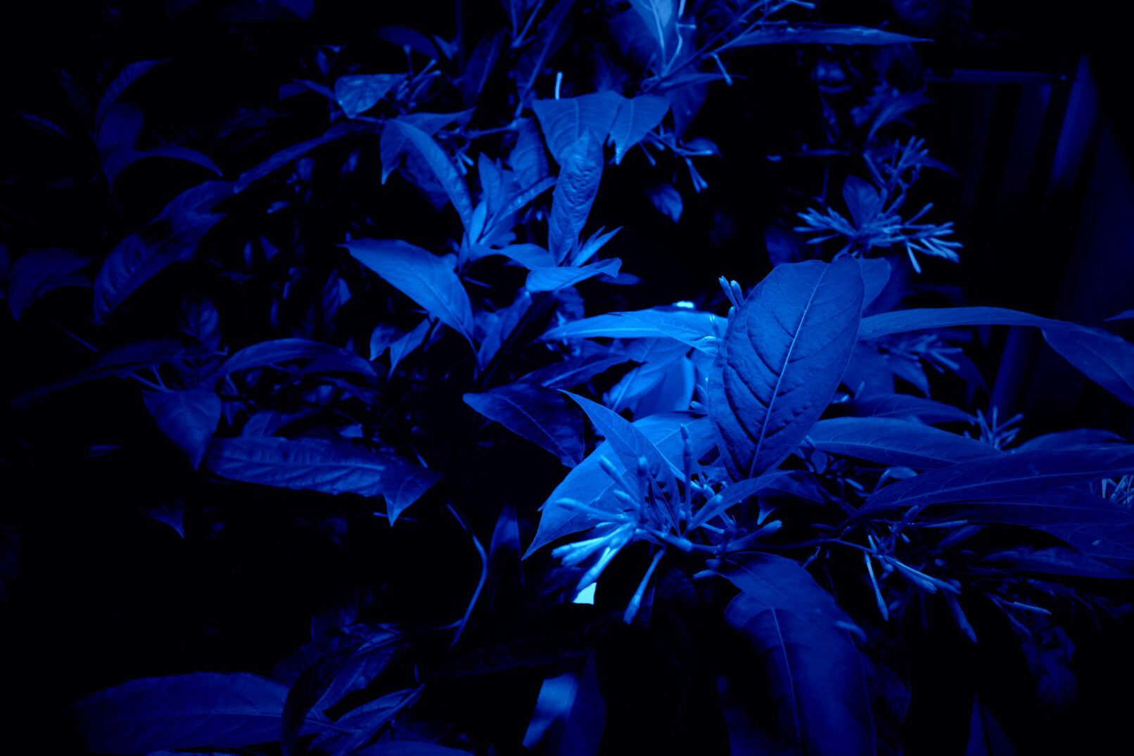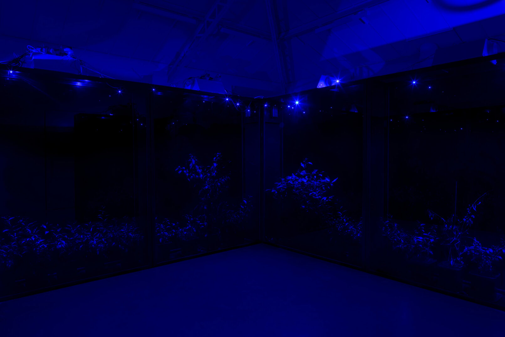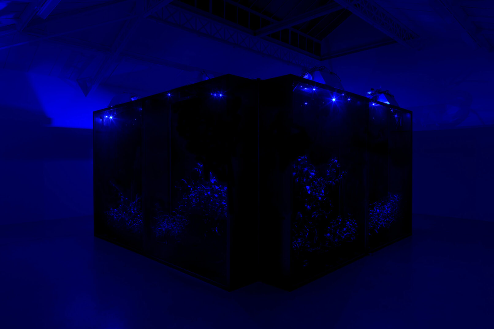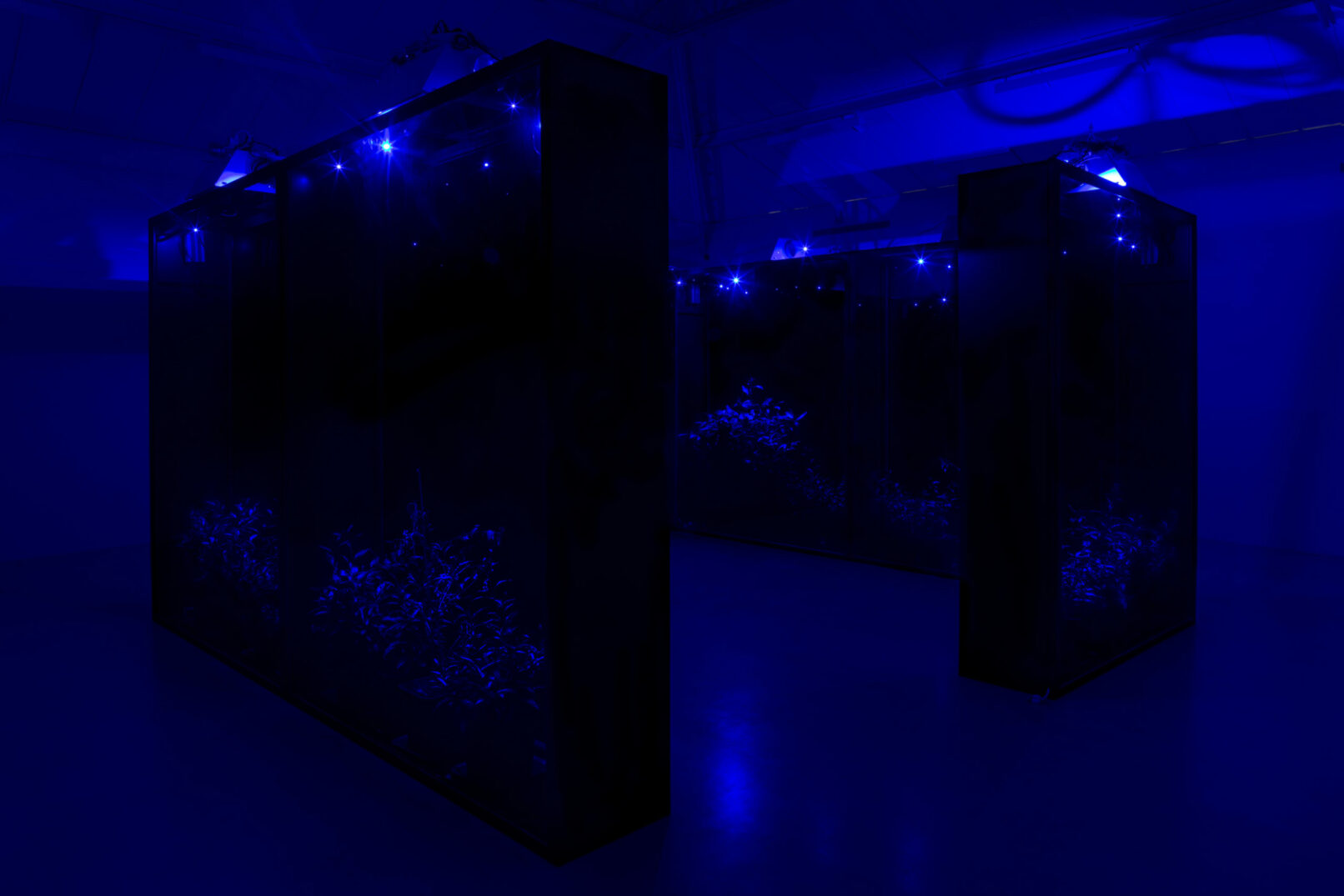 Installation. Ensemble of 7 tinted glass terrariums, Cestrum nocturnum, horticultural lighting, moonlight lighting, delay, 250 x 200 x 50 cm each;