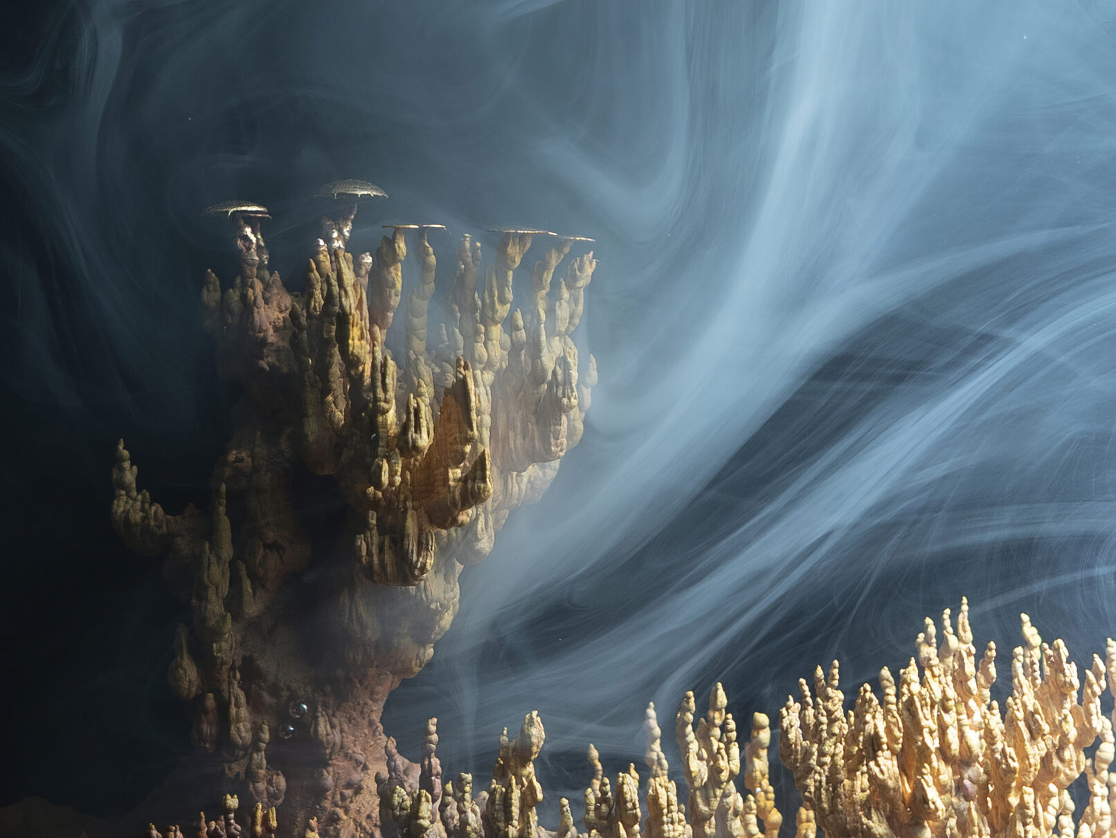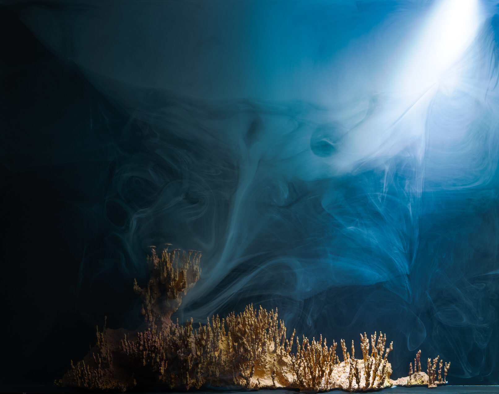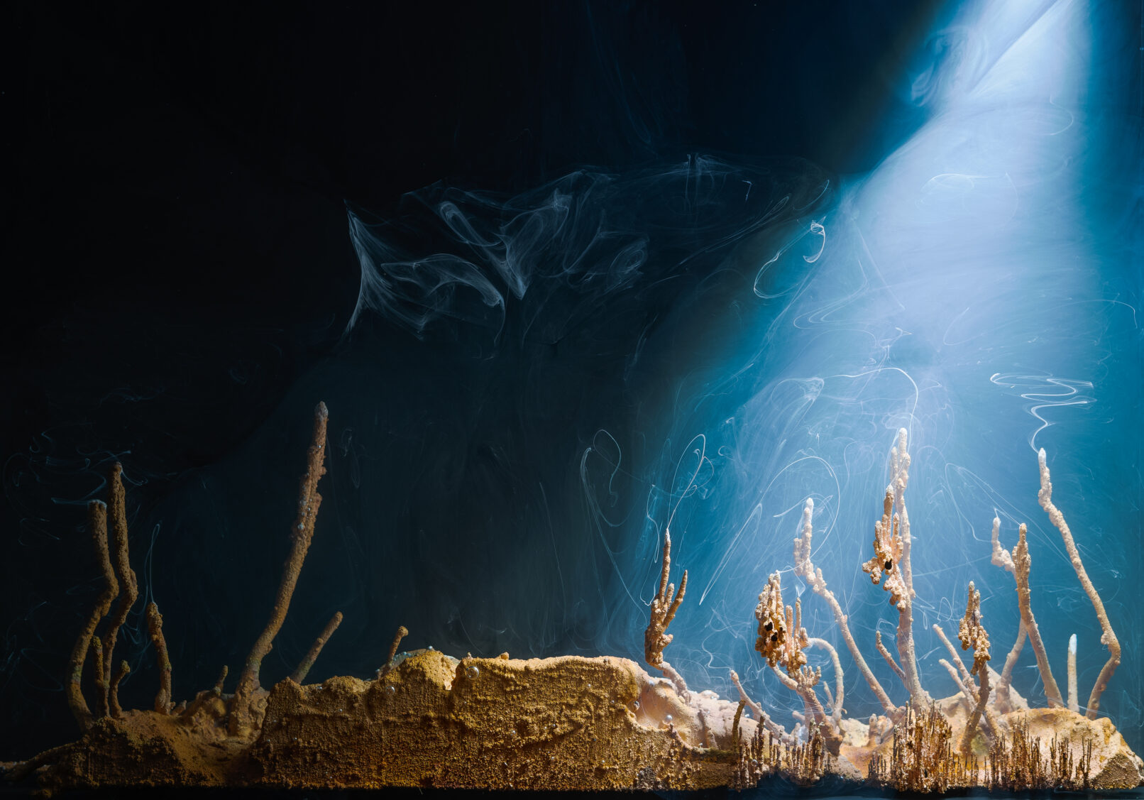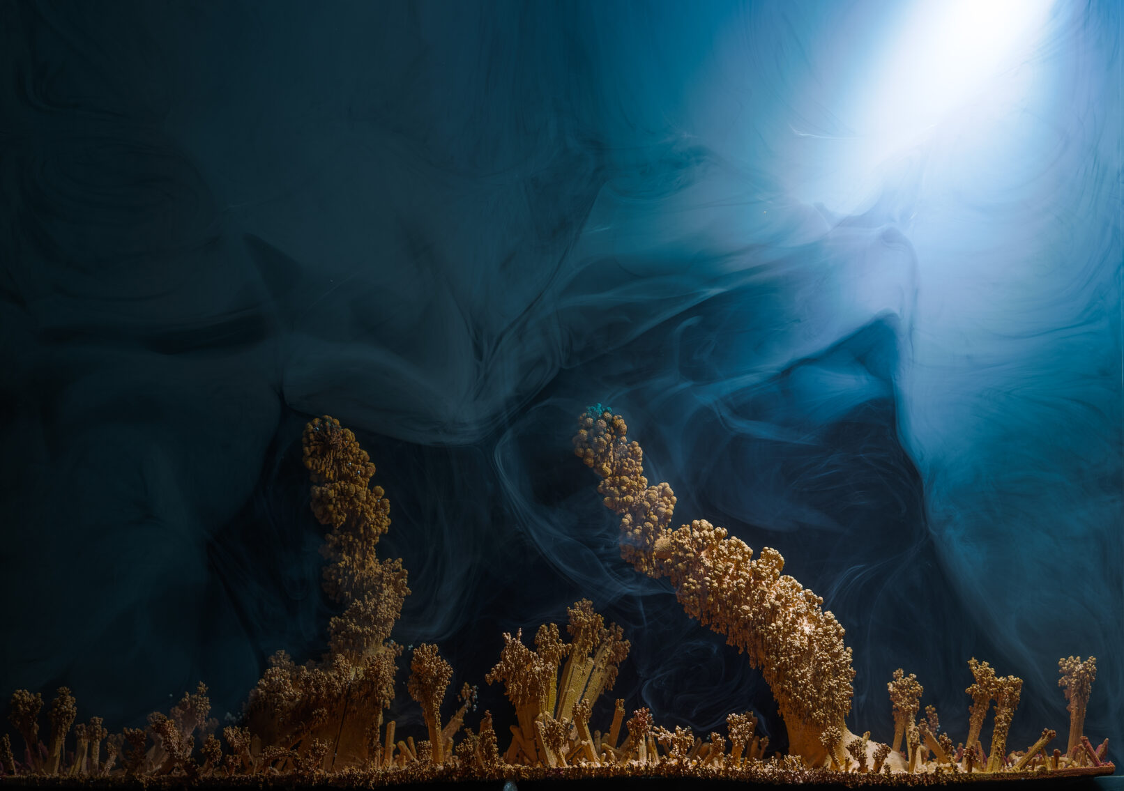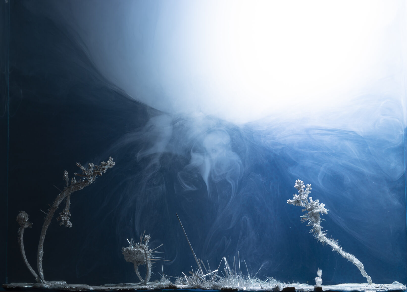 We thus use the intrinsic properties of metals, and their ability to determine themselves. These potentialities are activated by a few parameters, which modulated, allow a mineral landscape to appear, where there were only residues of wires and pipes. The resulting metal crystals, which are extremely fragile, are solidified by a resin flow, which stops their development at a chosen moment. They form strange landscapes, which one could imagine coming from a distant future or from another world, and which nevertheless result from our own, and from the physical and chemical properties of matter.