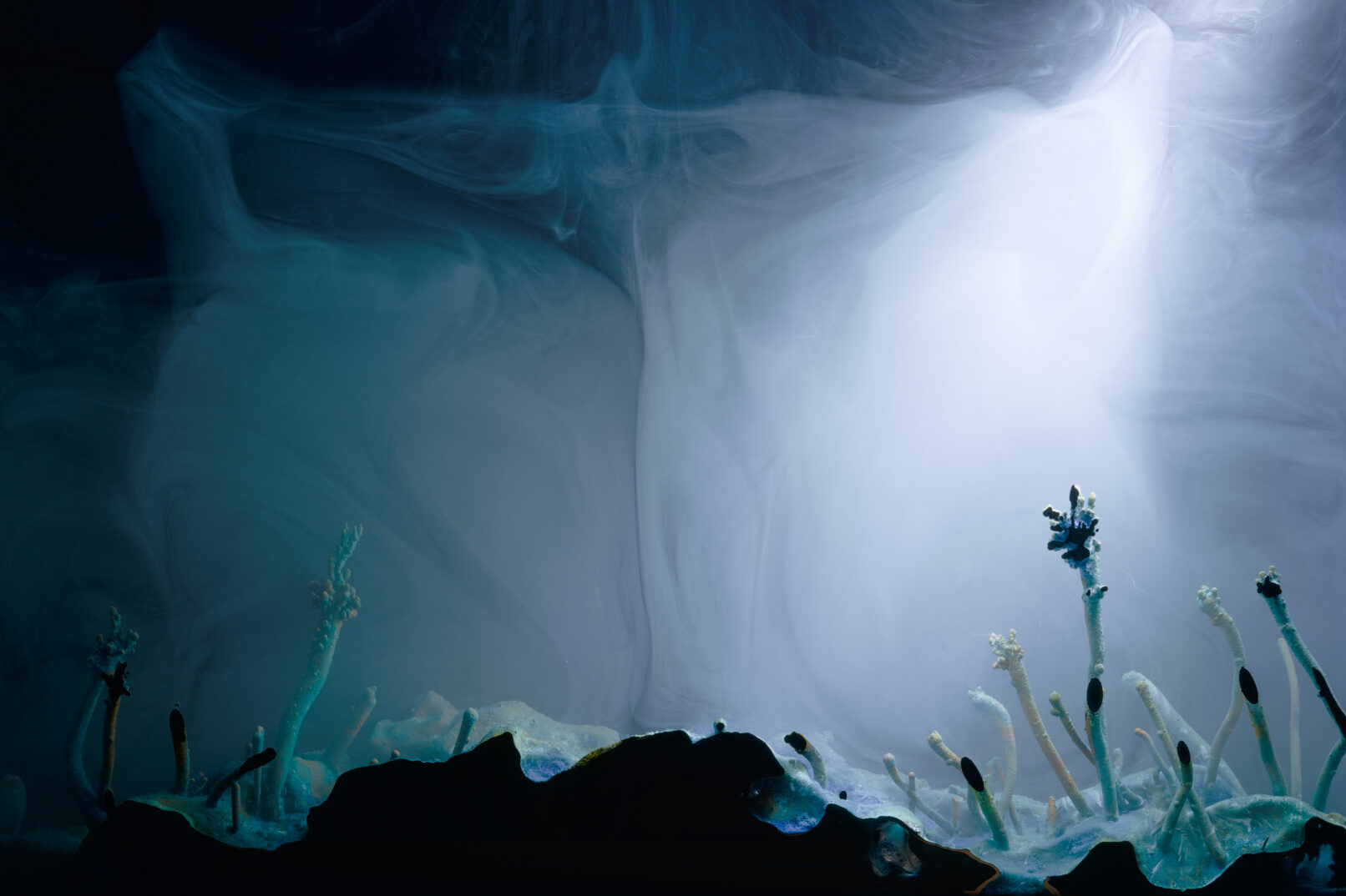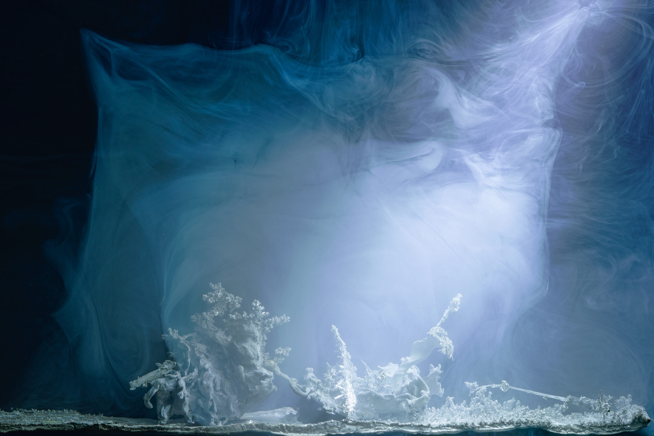 We thus use the intrinsic properties of metals, and their ability to determine themselves. These potentialities are activated by a few parameters, which modulated, allow a mineral landscape to appear, where there were only residues of wires and pipes. The resulting metal crystals, which are extremely fragile, are solidified by a resin flow, which stops their development at a chosen moment. They form strange landscapes, which one could imagine coming from a distant future or from another world, and which nevertheless result from our own, and from the physical and chemical properties of matter.