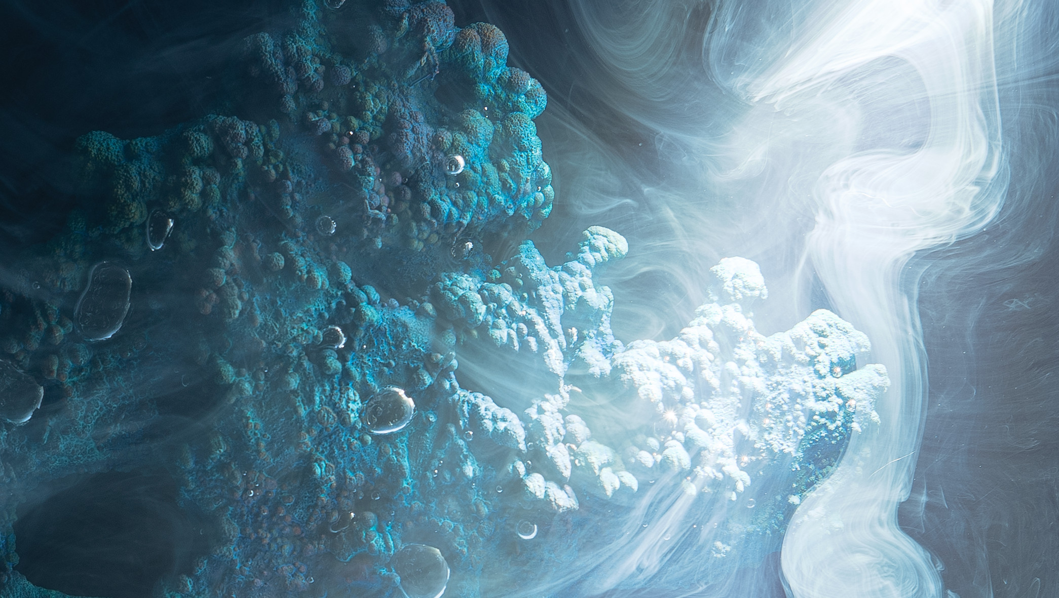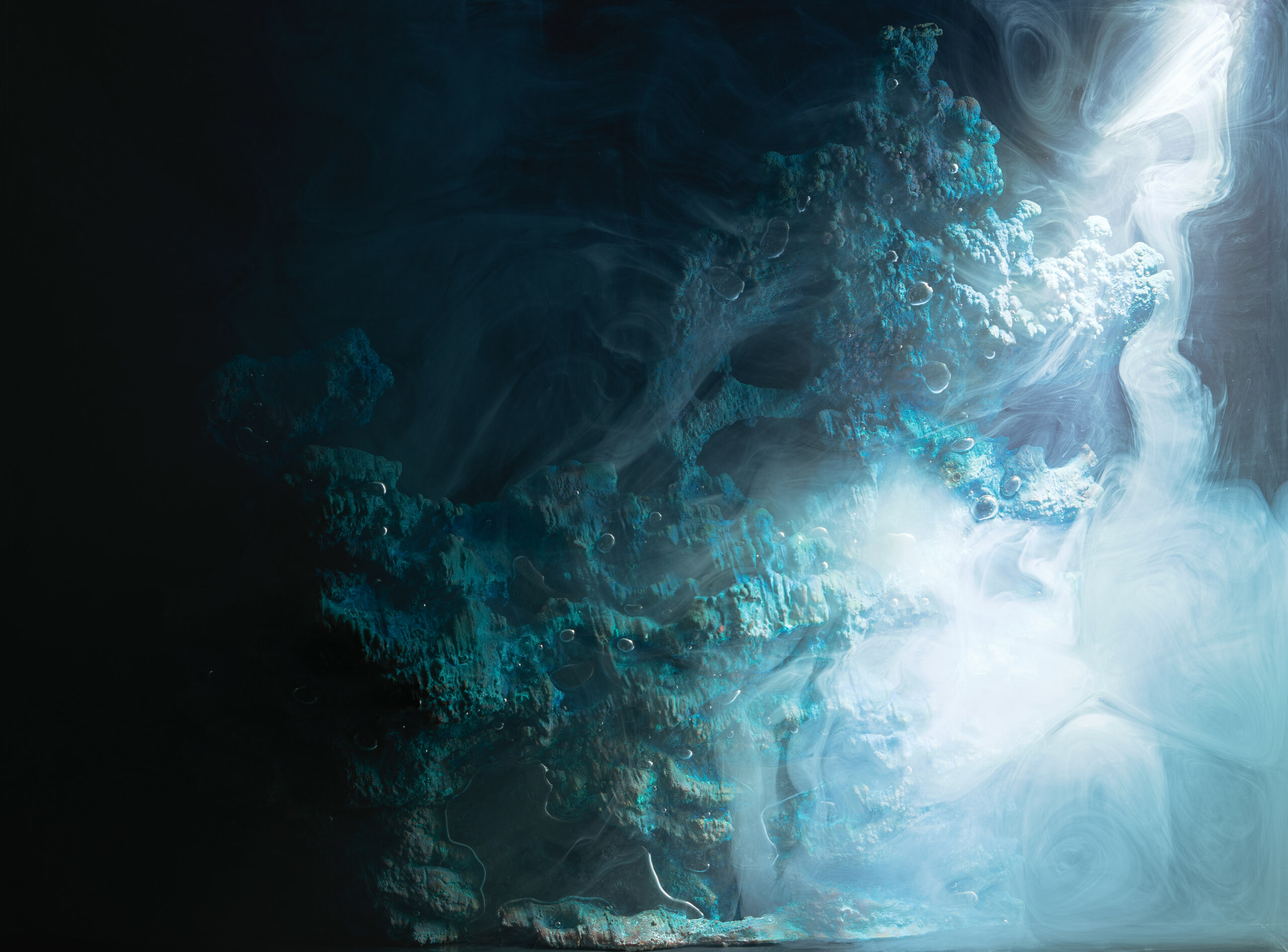 Immersed into electrolytic baths, the metals from printed circuits evolve at high speed, letting their matter escape to reorganize themselves into small worlds, with abundant and chiseled shapes.